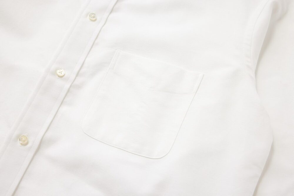 シャツのなかでもスポーティなディテール。ボタンダウンシャツの起源がポロ競技のユニフォームだったという歴史を考えても、ボタンダウンとポケットは高相性だ。1枚で着た際のアクセントにもなる。