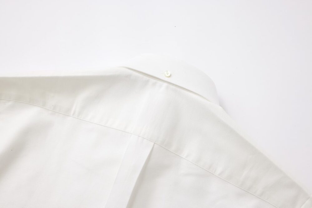 背面には、胸回りに余裕を持たせるボックスプリーツが。また、後ろ襟にもボタンがつく。実用的かつクラシックなディテールもトラッド好きには堪らないポイントだ。