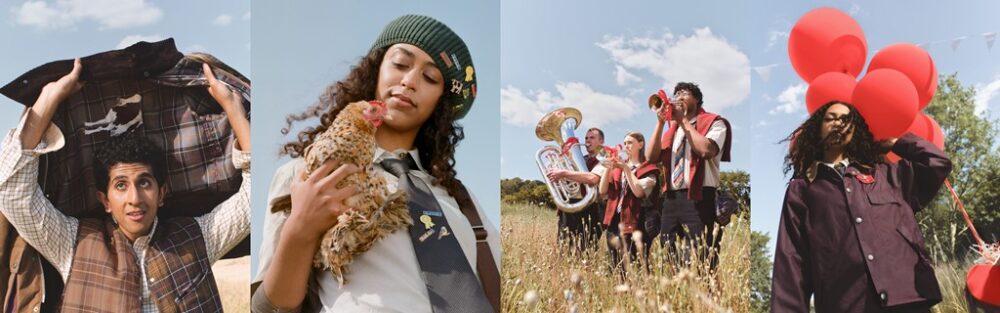 本コレクションは、英国の「カントリーショー」から着想を得ており、ユーモアを交えたアプローチでカントリースタイルを再構築している。独特な色合いのワックスドコットンやパッチワークのディテール、さらに“フリージアン牛”のモチーフなど、遊び心のあるデザインが随所に取り入れられている。