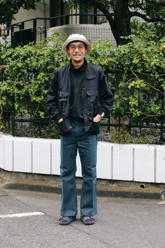 普段の休日に着るならと、化繊のシャツにパンツ、足元はサンダルというラフなスタイルにベストを合わせた。「つい最近、子どもと一緒に自宅近くの釣り堀へ出かけました。そんな休日の延長線上で着るイメージで合わせています。収納力抜群のベストなのでバッグいらずで、もっと気軽に出かけられそうですね」