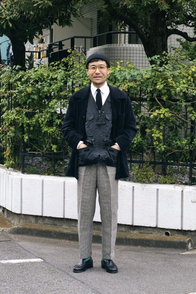 今年からフリーランスとして活躍する安武さん。ドレススタイルに定評のある彼に、フィッシングジャケットをルーツに持つ[ログリバーベスト]を着てもらった。アウトドアライクなディテールを満載したベストも、安武さんの手にかかればすっきりと都会的に。ジャケットに重ねても自然に馴染み、その巧みなバランス感覚にはさすがのひと言