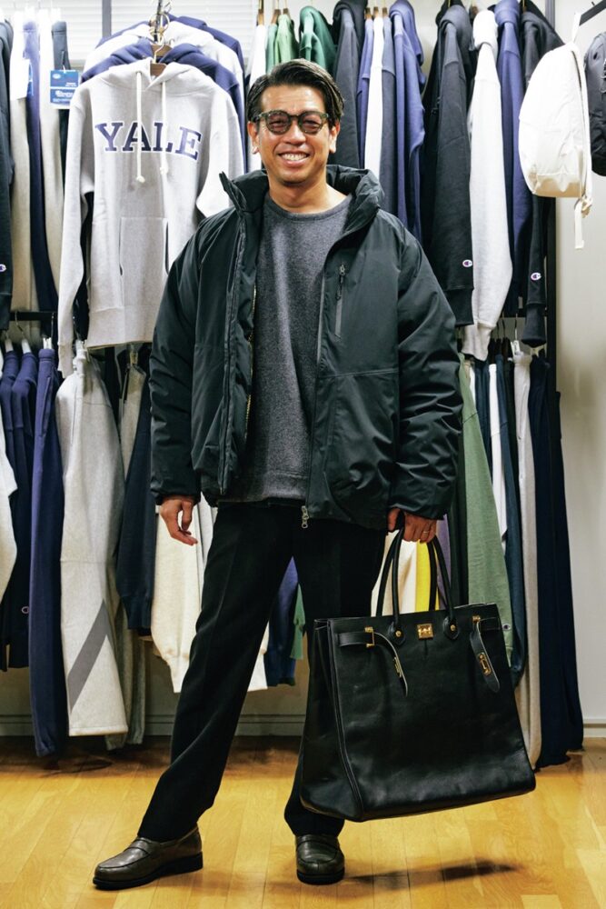 「今期の目玉となるアイテムのひとつは、90年代のスキージャケット[パウダーケグ]をベースにしたダウンジャケットです。[パウダーケグ]は、もともとスノーアウトドアで使用されていたということもあり、多様な防寒機能を兼ね備えていますが、現代のビジネススタイルでも着用できるデザインに落とし込みました。例えば裾のリブをなくしてアウトドア感を和らげたり、カジュアルなジッパーをブラックの止水のものにして、よりスマートな印象にしたり。防水素材の採用はもちろんのこと、首元に収納式のフードを備え、突然の雨にも対応できるようにと、足し引きでバランスをとっています。