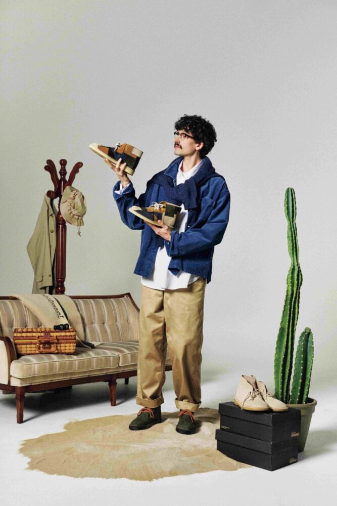 そしてこのたび、そんな[デザートブーツ]の記念すべき75周年を祝うモデルが登場。「ローデングリーン」というカラー復刻とパッチワーク仕様のふたつのモデルは、いずれもユニークで特別感を与えてくれつつも、どんなスタイルにも馴染みやすい。改めて[デザートブーツ]の完成されたデザインに、感服するばかりである。
