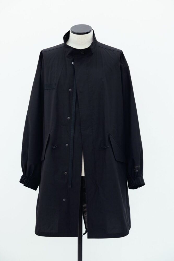 軽量かつ耐水、透湿、防風といった高機能で知られる英国「パーテックス」の「シールドプロ」を用いたナイロン・コート。ベースとしたのは米陸軍の寒冷地用アウターとして1965年に登場した「M-65」だ。同モデルに特徴的なフィッシュテールと呼ばれる後ろ身頃の裾部分の形状はさりげなくデザインとして取り入れながら、全体の印象をミニマル&シックに仕上げている。ブラック1色という潔さもいい。6万4900円