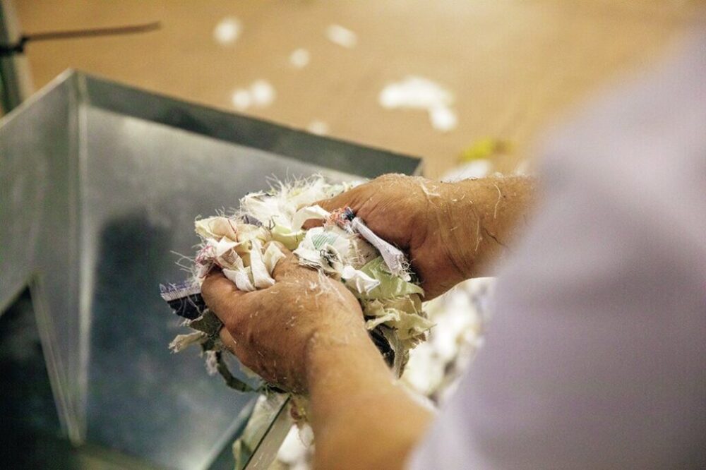 1.裁断で捨ててしまうコットンの端切れをカットしたもの。ここから綿作りは始まる。
