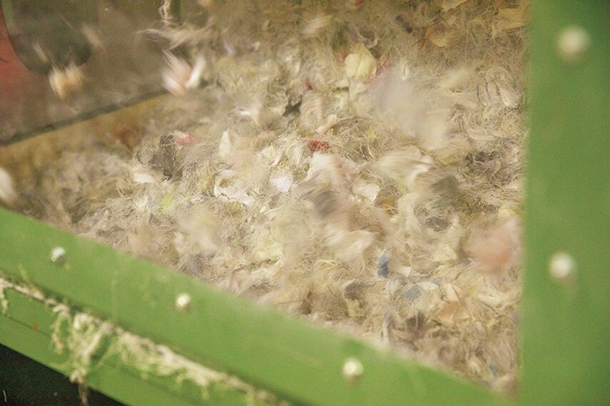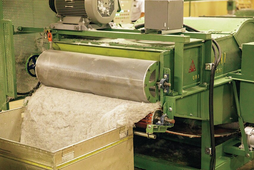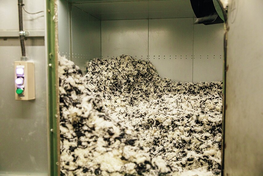 5.トルコ産のオーガニックコットンと混ぜていく工程。アップサイクル綿50%、オーガニックコットン50%の混率で混ぜ合わされる。