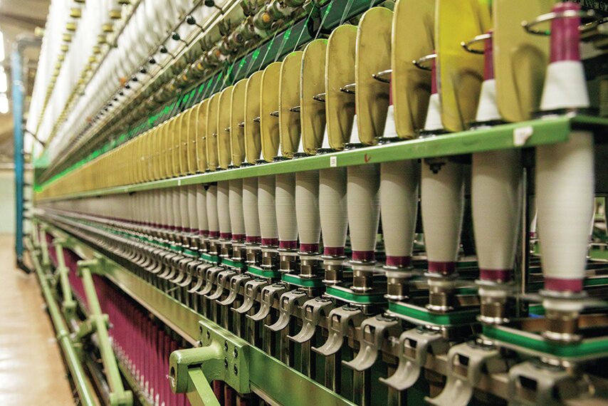 10.精紡機を用いてさらに引き延ばし、捻りをかけてボビンに巻き取っていく。