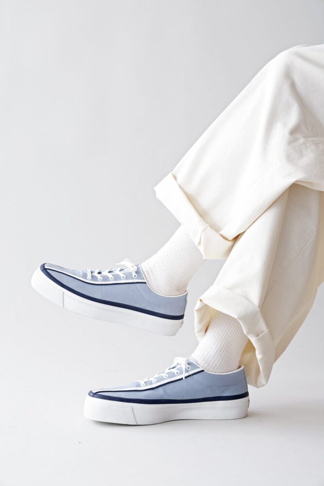 アイビーやワークなどの伝統的な装いに捻りを加え、唯一無二のスタイルを生む「ニードルズ」が、パリ発のセレクトショップ〈アナトミカ〉が手掛けるスニーカーブランド「ワクワ」と初のコラボ。つま先から足首にかけて走るパイピングのデザインは、クラシックの再構築を得意とする両ブランドならでは。ベースのスニーカーには医療用矯正靴に似た木型を用い、疲労を軽減。スウェード3万1900円、キャンバス2万6400円(ネペンテスTEL03-3400-7227)