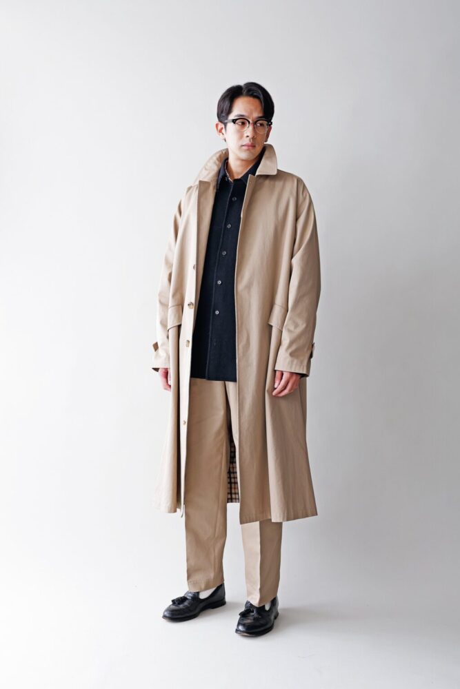 英国王室御用達ブランドとしても知られる1894年創業の老舗「ダックス」のクラシックとパターンメイキングに優れる「サイ」の設計手法が融合したコレクションが登場。「ダックス」を象徴するハウスチェックを裏地にあしらったバルマカーンコートのシルエットの美しさは惚れ惚れするほど。コート18万1500円、シャツ16万5000円、パンツ7万5900円(三共生興ファッションサービス株式会社TEL03-5651-7890)