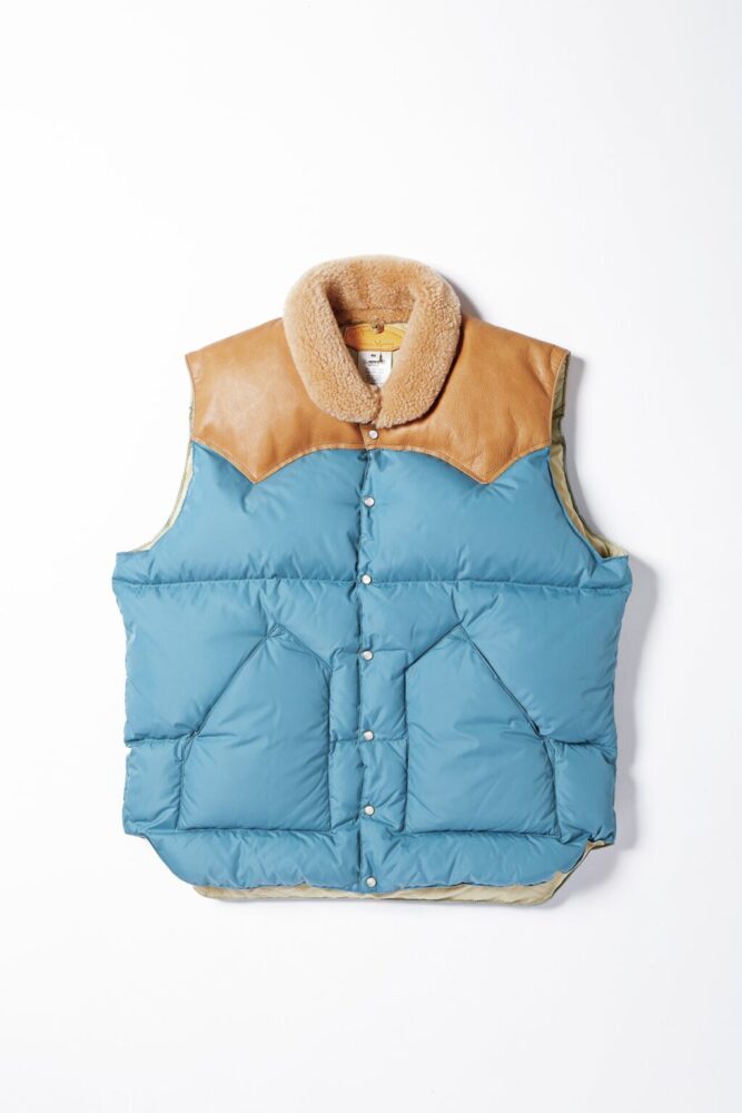 1枚革のレザーヨークが特徴的な「ロッキーマウンテンフェザーベッド」のダウンベストの中でも襟に天然ムートンを使用した[クリスティベスト]がベース。表地、裏地、ヨーク、襟の配色をユナイテッドアローズのオリジナルで構成した特別な1着だ。クラシックアウトドアなムードが漂うライトブルーと温かみのあるベージュの絶妙な組み合わせにグッと来る。8万4700円(ユナイテッドアローズ六本木ヒルズ店TEL050-8893-4217)