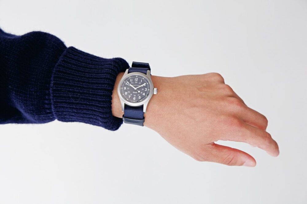 「ハミルトン」の代表的なミリタリーウォッチを、シップスのコーポレートカラーであるネイビーで展開。ダイヤルに1960年代頃のヴィンテージに見られる斜めのロゴを配し、裏蓋には「for SHIPS」の刻印が入る。8万9100円