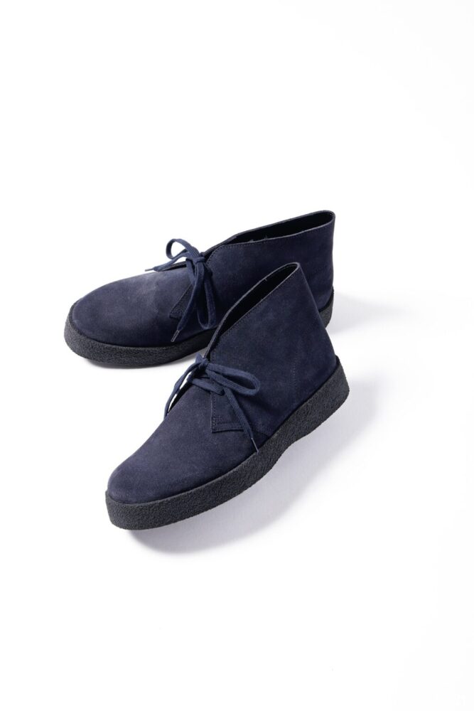 [デザートブーツ]にマッドガードが施され、クレープソールのモデルに比べてすっきりとした表情が特徴。ネイビーのアッパーに英国らしいソールと、両ブランドのアニバーサリーにふさわしいデザインに仕上がっている。3万800円