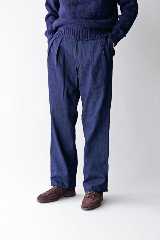 今期のデニム素材を使用したアルヴィ トラウザーズシリーズは、映画『アニーホール』でウディ・アレンが着ていたチノを再現したアイテム。クラシックなウォッチポケットと2タックデザイン、ズドンと落ちるストレートシルエットが特徴だ。きれいめに仕上げられている12オンスデニムを採用したことで、ヴィンテージ感を保ちながらも、洗練された印象を与える1着。2万4200円(セプティズTEL 03-5481-8651)
