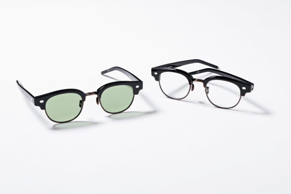 セルロイド製の細身サーモント[Ⅳ]に程よいボリュームを加えた[Ⅳ BR]シリーズ。角を落としたウェリントン型[no.1]にシルバー925製バランサーや蝶貝ノーズパッドなどのシグネチャーパーツを搭載。深い艶感と存在感を放ちながら、別注色「ビアブラウン×ブロンズ」と鮮やかな色味のレンズが生み出すモダンなムードが新鮮さを添える。サングラス11万円、クリアレンズ10万1200円(コンティニュエTEL03-3792-8978)