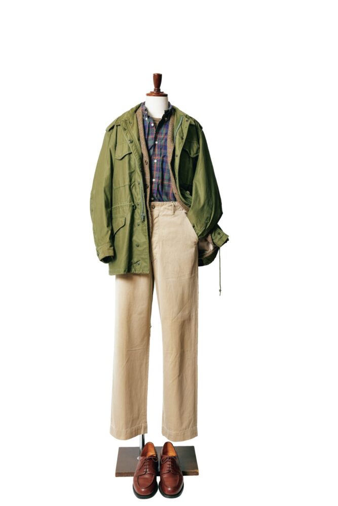 M-51ジャケット1万6500円、シャツ8800円、チノパン2万9700円/すべてヴィンテージ、ツイードジャケット1万6500円/ポロ ラルフローレン、ボタンダウンシャツ6600円/ギットマン ブラザーズ、シューズ8万8000円/ジェイエムウエストン