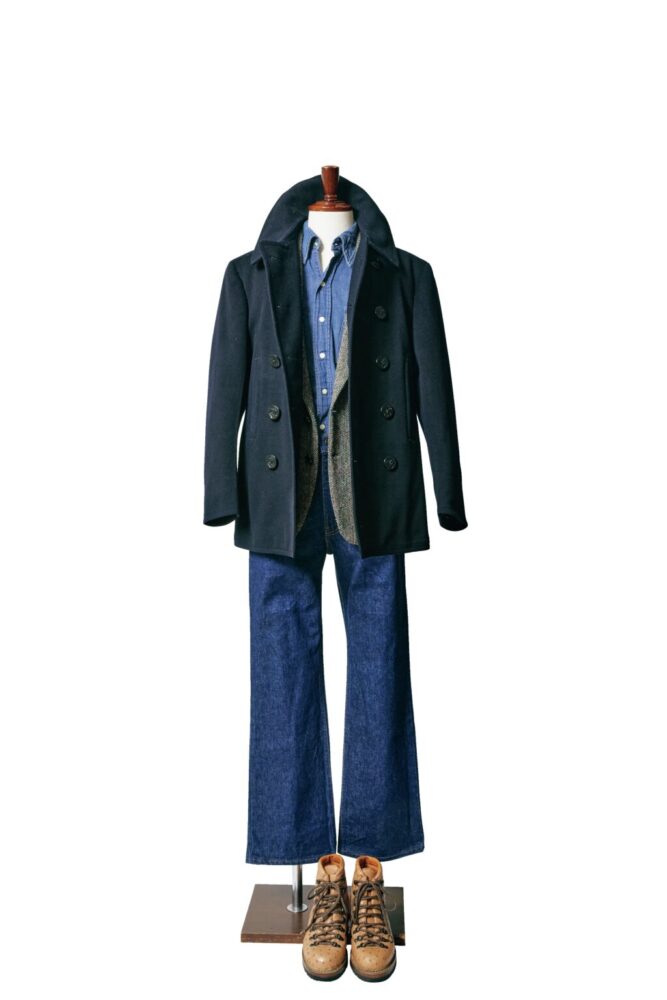 「劇中の装いをミックスさせたようなスタイリングです。難しいことはせず、素直にスタイリングを組みました。劇中でピーコートを着ているシーンでは、ジャケットを着てはいないのですが、別のシーンで着ているグレーのヘリンボーンジャケットをレイヤードした方が洒落ていると思い、2つのシーンを掛け合わせたというわけです。クラシックな10ボタンのピーコートは劇中のロバート・レッドフォードと同様に無造作に襟を立てるのがポイント。パンツはこの映画が公開された1970年代を象徴するようなブーツカットにトレッキングブーツという、こちらも劇中の装いをサンプリングしています。このブーツカット×トレッキングブーツは当時における定番の合わせともいえますが、いまの時代においても新鮮に感じられますよね。コーディネイト全体を見ても、時代性はありつつも現代にいても何ら違和感のない、程よいバランスに仕上がったのではないかと思います」