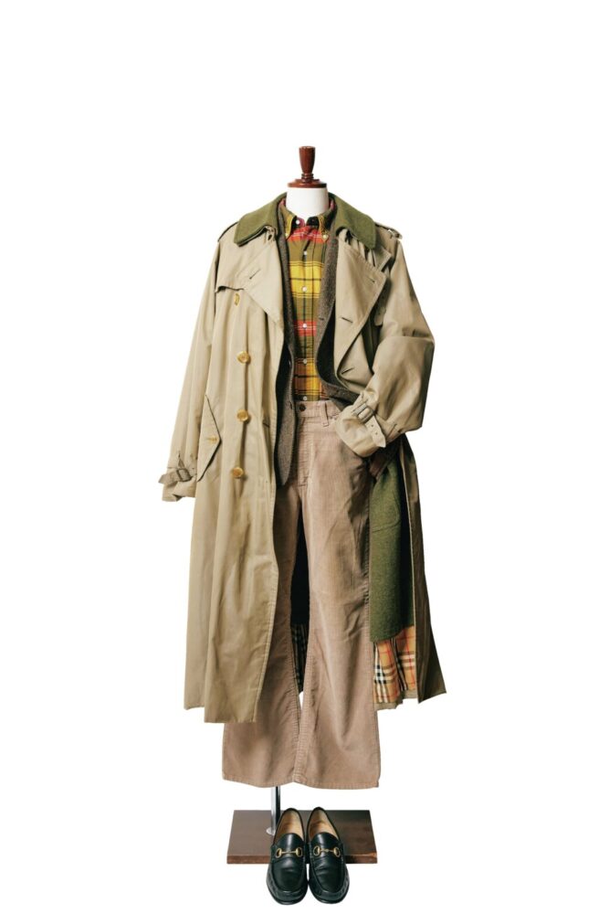 トレンチコート6万9300円/バーバリー、ツイードジャケット7万7000円/ダブルアールエル、ボタンダウンシャツ6600円/ブラックフリース、コーデュロイパンツ6600円/リーバイス、ビットローファー2万9700円/グッチ