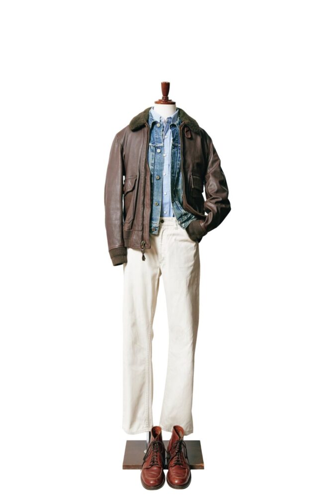 G-1ジャケット3万3000円/ウィリス&ガイガー、デニムジャケット44万円/リーバイス、シャツ9900円/ラングラー、パンツ8万8000円/リー、ブーツ4万4000円/オールデン