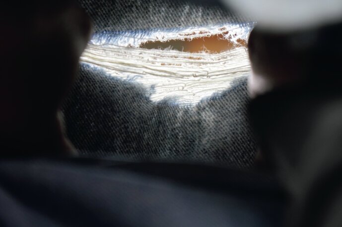 ただ穴が空いている場所を縫うのではなく、ダメージのある薄くなっている部分まで補修が必要なため、光に当てて弱っている生地を確認する。