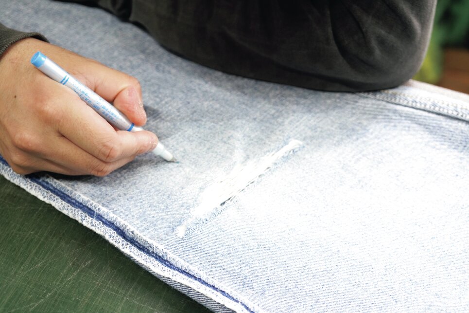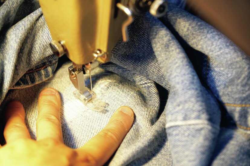 今回のデニムは横糸が残り、縦糸がちぎれているため、縦糸を増やすイメージで縫っていく。スピードを抑え、狭い幅でジグザグと往復する。