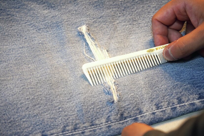 今回の穴は、横糸が残っているためその糸を利用して補修をしていく。縫った後の糸の向きを整えるためにクシを使い残った横糸を整える。