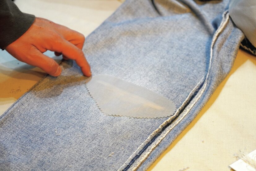タタキ縫いが終わったら、接着芯を固定していたしつけ糸をまず外す。最後にアイロンで生地の歪みを整えれば、補修の完成だ。