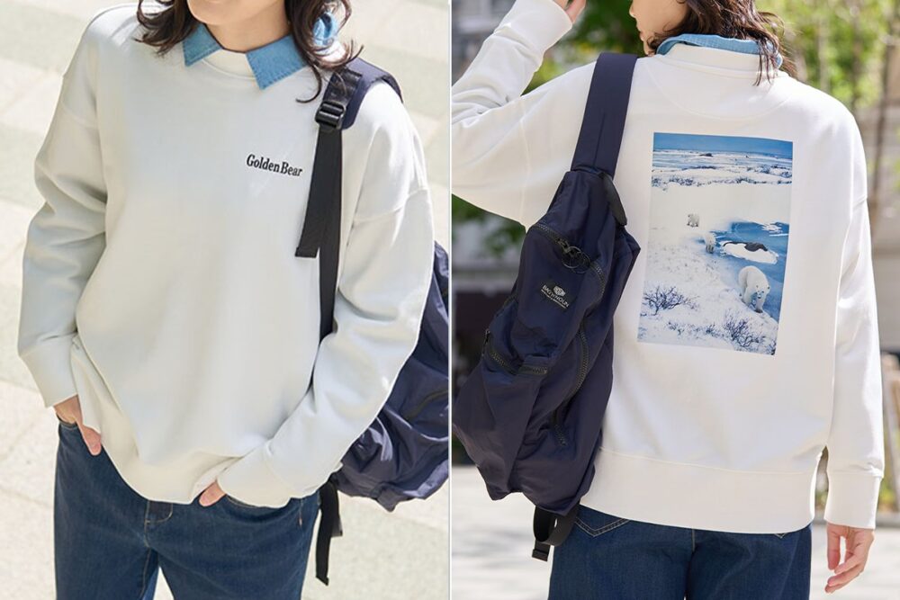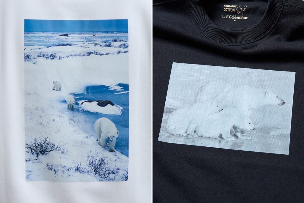 カラーはアイボリーとブラックの2色展開。アイボリーは胸に「Golden Bear」ロゴをあしらい、写真をバックプリントに配置。ブラックは正面に写真をプリントし、左袖にロゴを施した。メンズ・ウィメンズ共通のデザインとなっている。