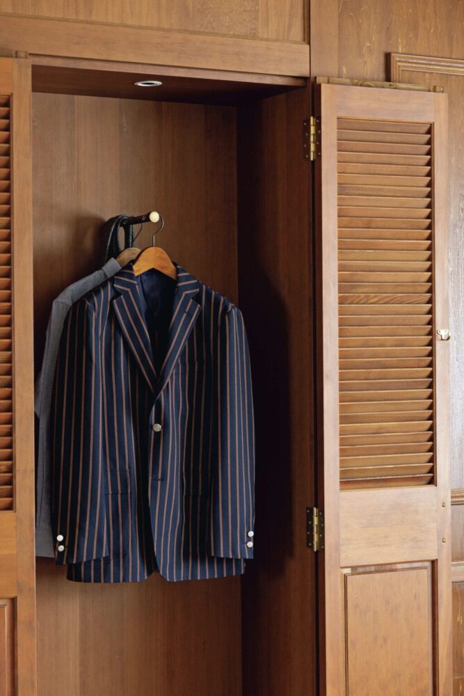 肩パッドなし・背抜き仕様の軽快なジャケットに、オリジナルで製作した落ち着きのあるアイビーストライプやメタルボタン。これぞクラシックアイビーの佇まい。7万5900円