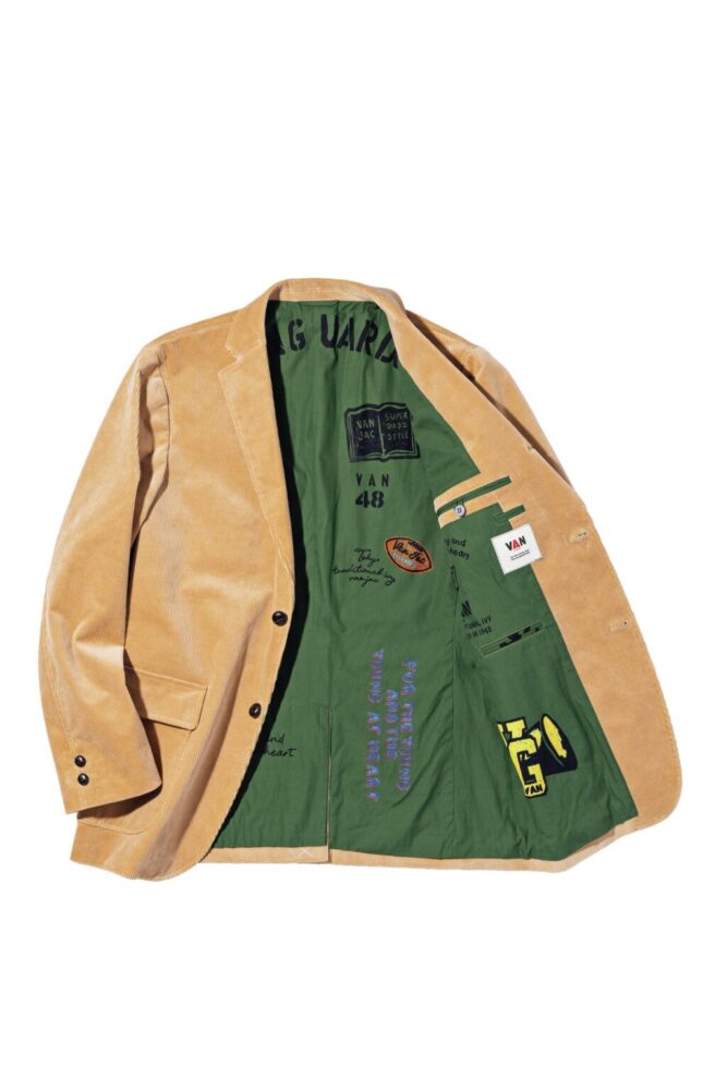 オーソドックスな3つボタンジャケットを細畝のコーデュロイで製作。グリーンの裏地には、オリジナルのメモリアルプリントがあしらわれ、ほのかな個性を醸す。6万500円