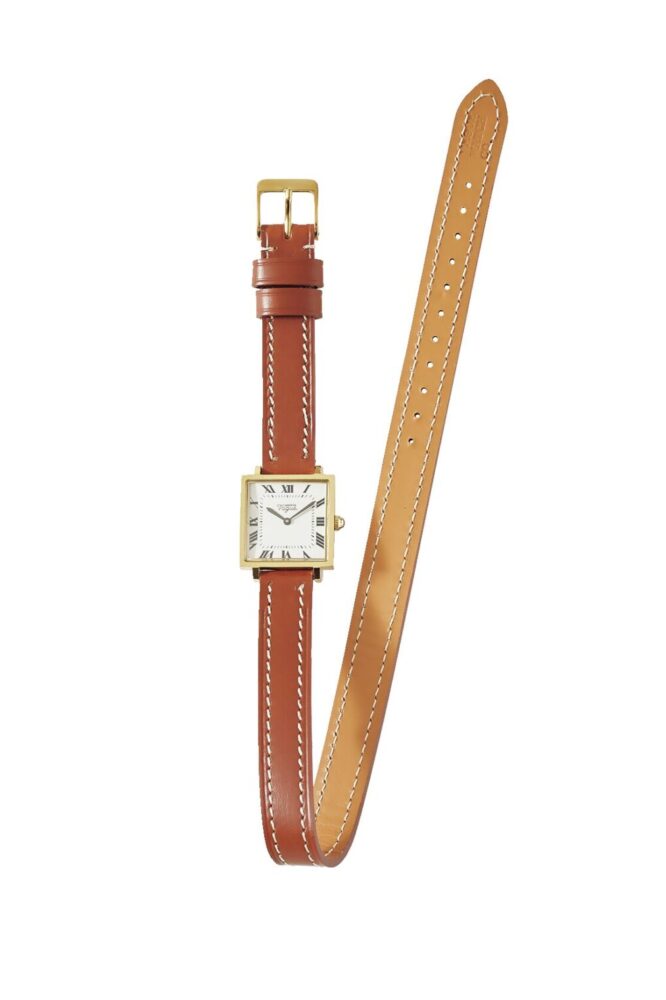 シンプルで洗練されたスクエア型の本体と、ボリュームのある2重巻きのレザーベルトが絶妙にマッチ。時刻を知る、という道具としてはもちろんのこと、時計とブレスレットの境目のないような独特のデザインは、アクセサリー感覚で身につけるのもよいだろう。あえて、ワークやミリタリーといった武骨なコーディネイトに取り入れてみるのも一興である。