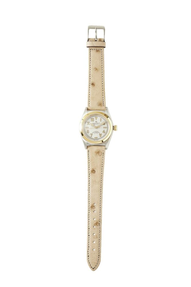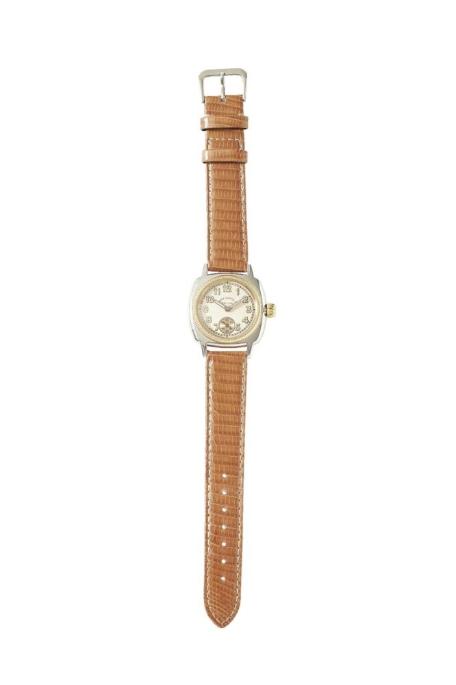 ブランドの初代プロダクトである、1920年代に誕生した世界初の防水防塵腕時計をベースとしたモデルのアップデートバージョン。本体には職人の手によりエイジング加工が施されている。こちらもエクステンションベルトを採用。3万8500円