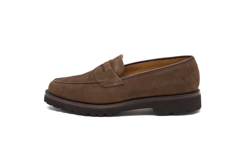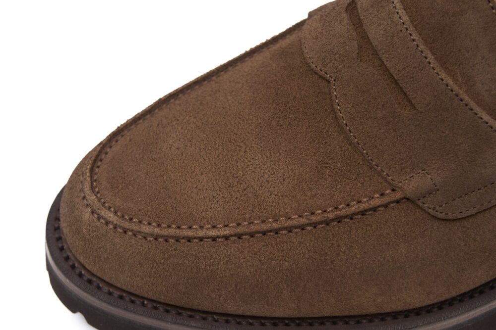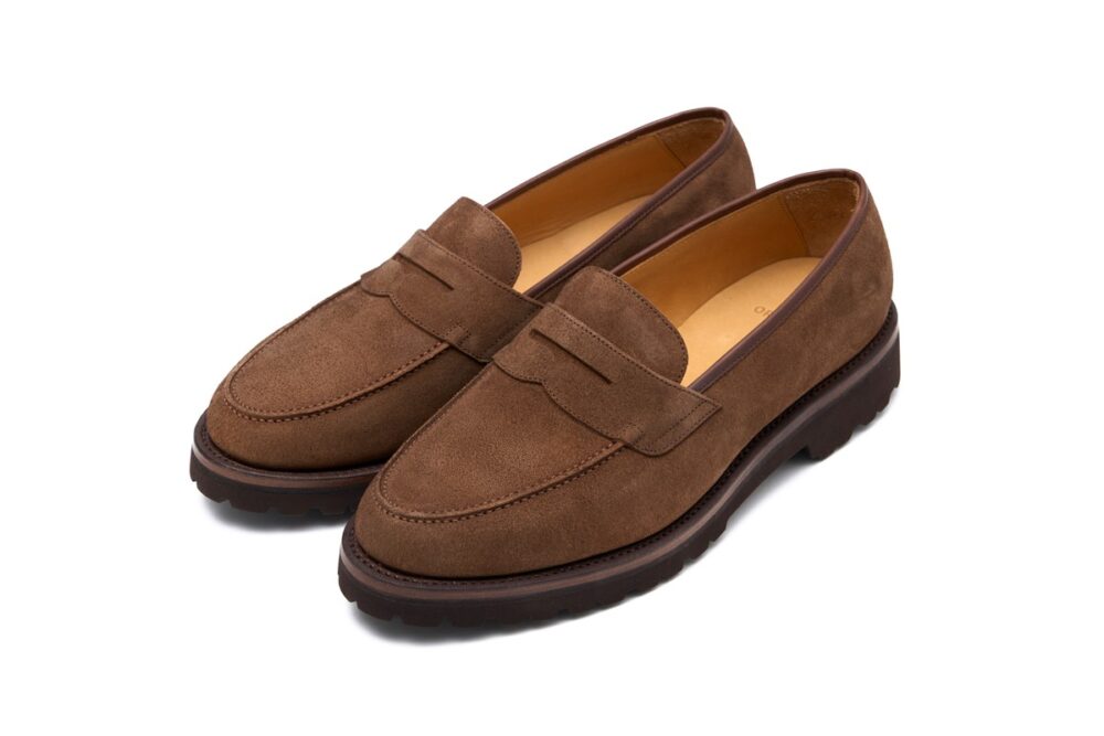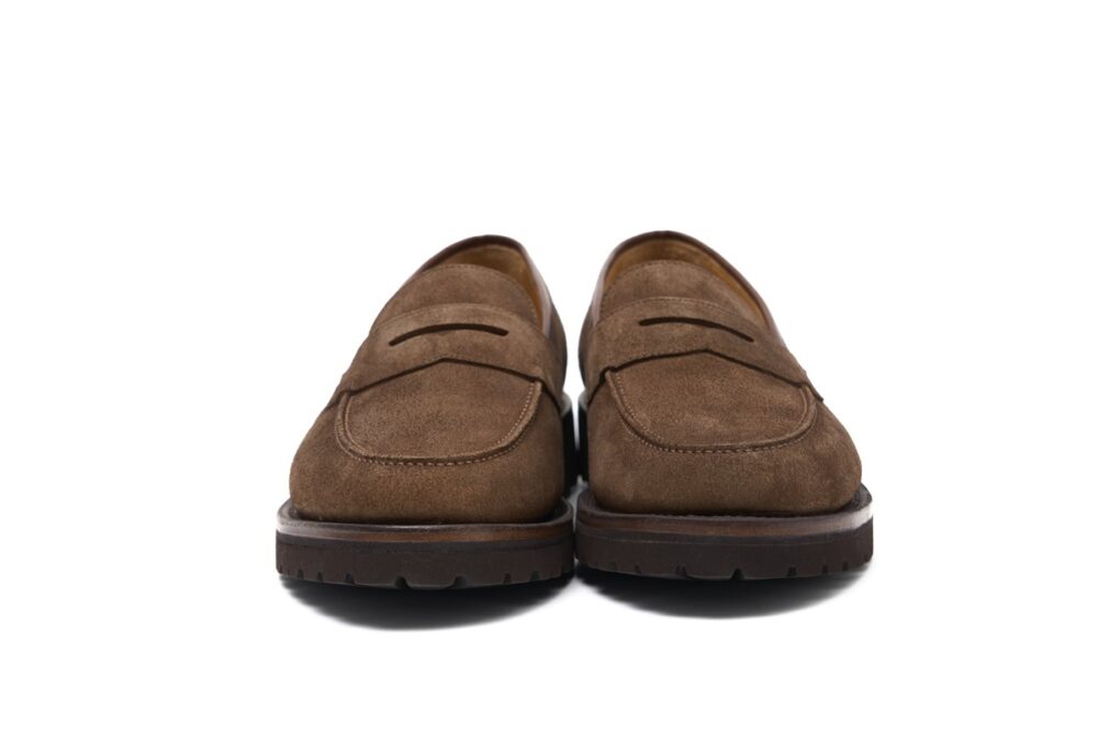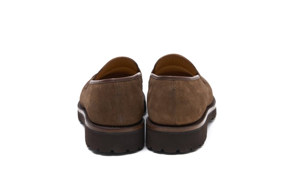 採用している木型やフロントのモカ縫い、サドルのデザインなどはベーシックなローファーそのものですが、毛足の長いラフアウトスウェードの素材感に合わせ、コバの張り出しを大きくし、ソールもボリュームのあるビブラムソールを採用するなど、アウトドア感も感じられる絶妙な表情となっています。