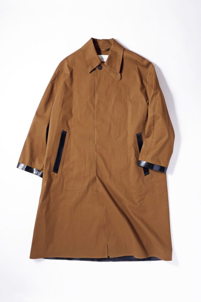 「マッキントッシュ」の代名詞ともいえる職人の手作業で仕上げられたゴム引きコートを「スタジオ ニコルソン」らしい構築的な設計で製作。袖とポケットに配置された黒のテープがアクセントに。28万6000円(マッキントッシュ ジャパンTEL03-3589-0260)