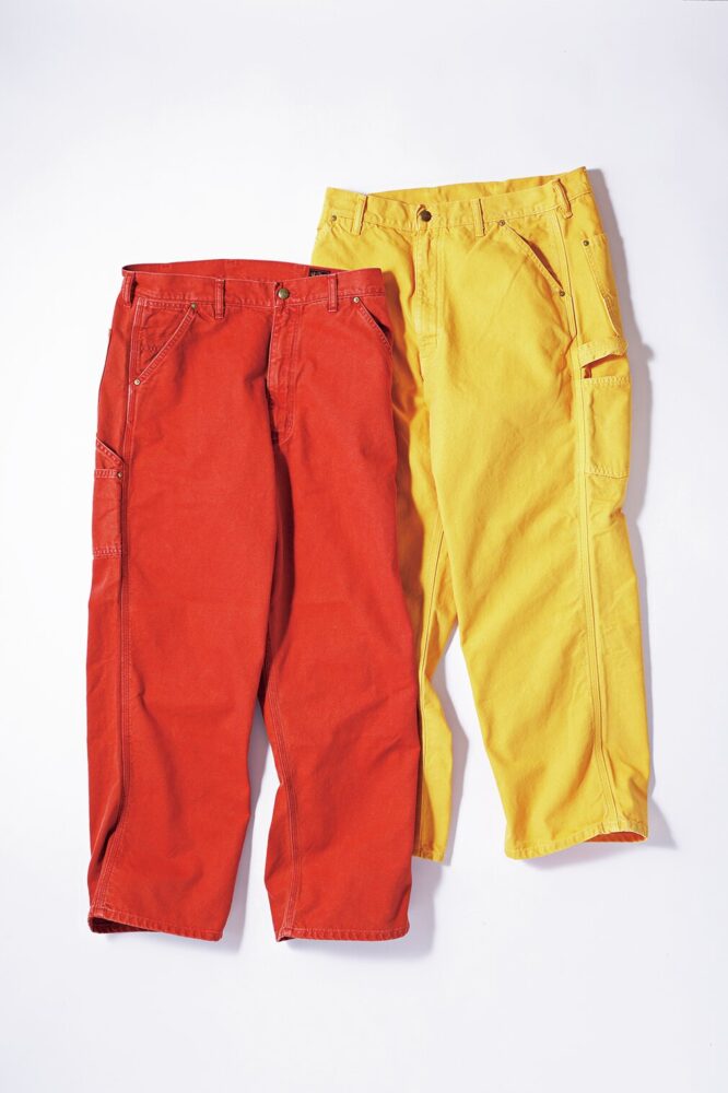 「オアスロウ」定番のペインターパンツの新色に鮮やかなレッドとイエローが登場。ベーシックカラーに頼りがちな秋冬の装いを劇的に変えてくれること間違いなしだ。カラーパンツに挑戦する際の1本目として強く薦めたい。程よいユーズド加工も絶妙。2万9700円(ベースデニムプロダクツTEL0798-74-8106)