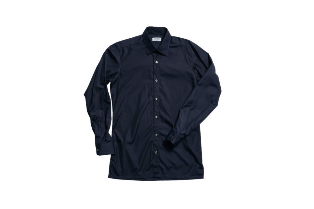 世界最古のシャツショップとしても知られるフランスの名門。ブラックだとリネンのイメージが強いが、あえてコットンブロードをチョイスした。ベーシックなレギュラーカラーで、ボタンには黒蝶貝を用いるなど、シンプルながらも上質感溢れる。私物