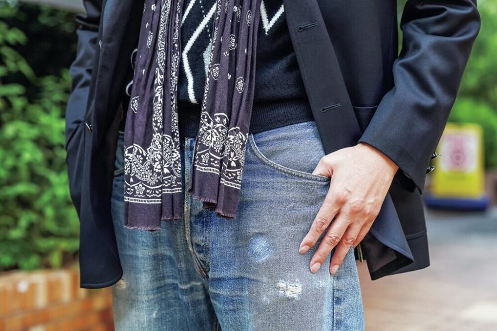 ブラックのブレザーに同色系のアイテムを合わせると艶っぽくなりすぎてしまうため、あえて美しいインディゴブルーとなった501をセレクト。また未裁断のバンダナをストールとして使っているのもポイント。深みのあるコーデとなっている。