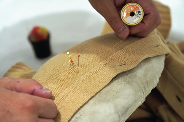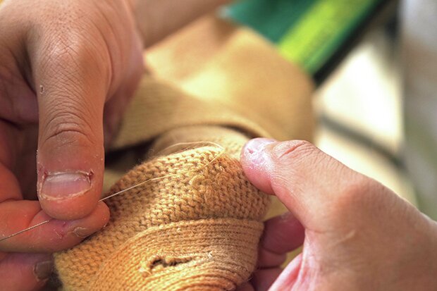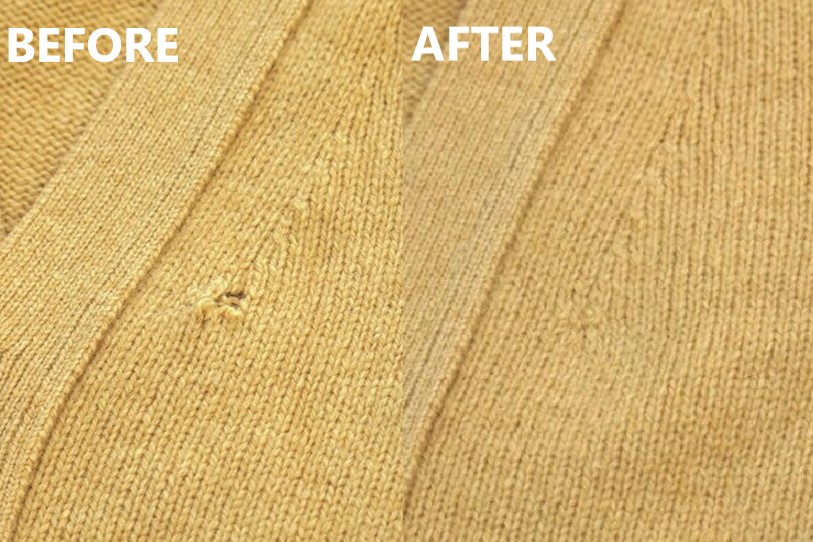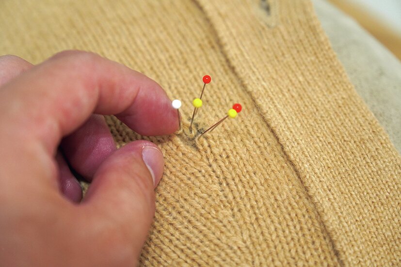 これまでのお直しはミシンを使ったものがほとんどであったが、今回のウール製のニットは手縫い。1cm程度の穴であれば糸を追加せずともぱっと見では気づけないほどに補修可能だ。