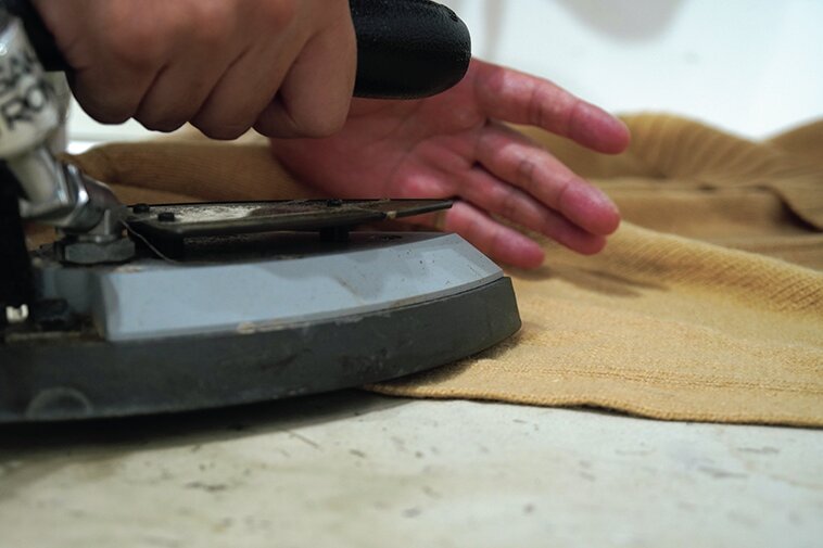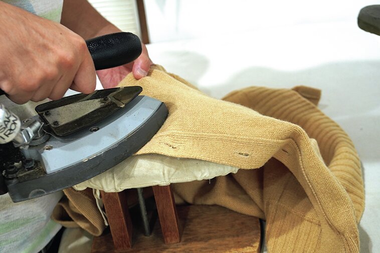 今回のニットはウール製。ほつれた部分を確認した後、アイロンを使って、補修部分を整える。この工程が出来上がりの綺麗さを左右する。