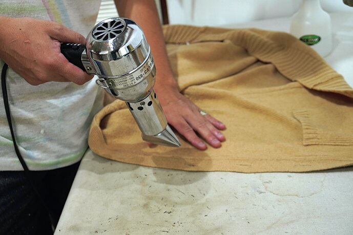 補修部分にスチームアイロンをかけていく。ぎゅっと押し付けるのではなく、5mm〜1cmほど浮かして熱いスチームを生地に当てるイメージ。