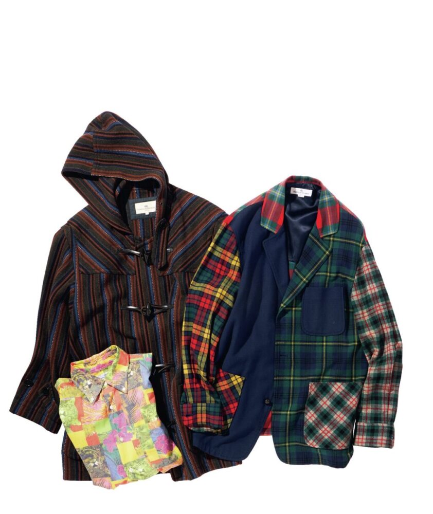 すべて「マリナ・ド・ブルボン」製。写真右は、60年代の「ペンドルトン」のジャケットをベースに、生地を別注して製作。当時の通称は「ローファージャケット」。写真左上は、タスマニアウールを使ったイタリア製「カルピーニ」の生地、牛革グローブ紐、水牛のトグルと上質な素材を採用。写真左下は、製作を本格的なオーダーシャツを手がけていた工場に依頼したプリントシャツ。