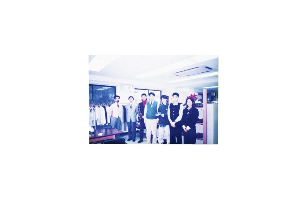 「オールデン」がラコタを代理店に、日本に初上陸した第1回目の展示会の写真。中央には現・血脇孝昌会長と現・血脇弾社長。「マリナ・ド・ブルボン」名義でダブルネームを製作した実績もある