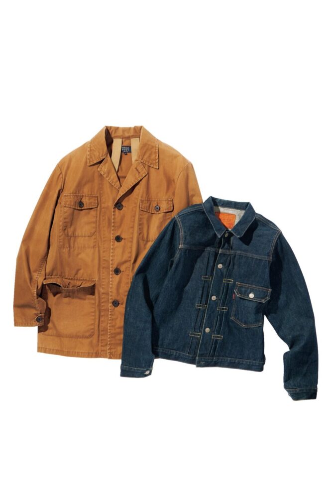 「タブロイドニュース」より、ハンティングジャケットは、40年代製の個体を参考にピボットスリーブやゲームポケットを取り入れつつ、日常着として作られたブランドらしい1着。デニムジャケットもヴィンテージのクオリティで、モダンかつスタイリッシュな仕上がりを心がけていたそう。