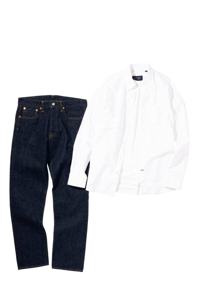 「ハンドルーム」が目指すは「上質なデイリーウエア」。なかでも約10年続く定番は、BDシャツとデニムパンツ。BDシャツはスーピマ綿を使って福島県で製作。見事なステッチワークが光るデニムパンツは広島のスペシャリストと開発し、岡山の縫製工場で仕上げている。BDシャツ2万2000円、中に着たTシャツ1万2100円、パンツ3万1900円(バウ インクTEL070-9199-0913)