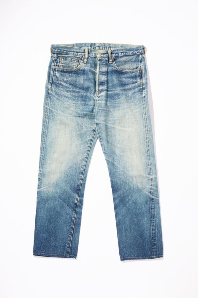 上で紹介しているデニムパンツと同商品で、藤澤さんが実際に穿き込んだもの。50年代製ヴィンテージデニムの色落ちや風合いを再現している。作りの良さが伝わるあまりにも美しい佇まい。