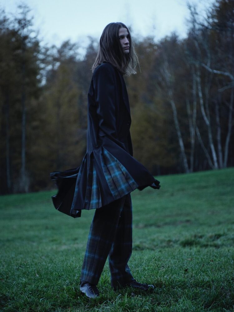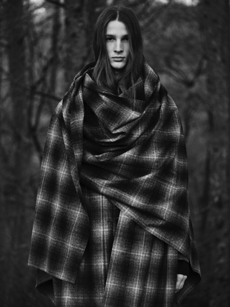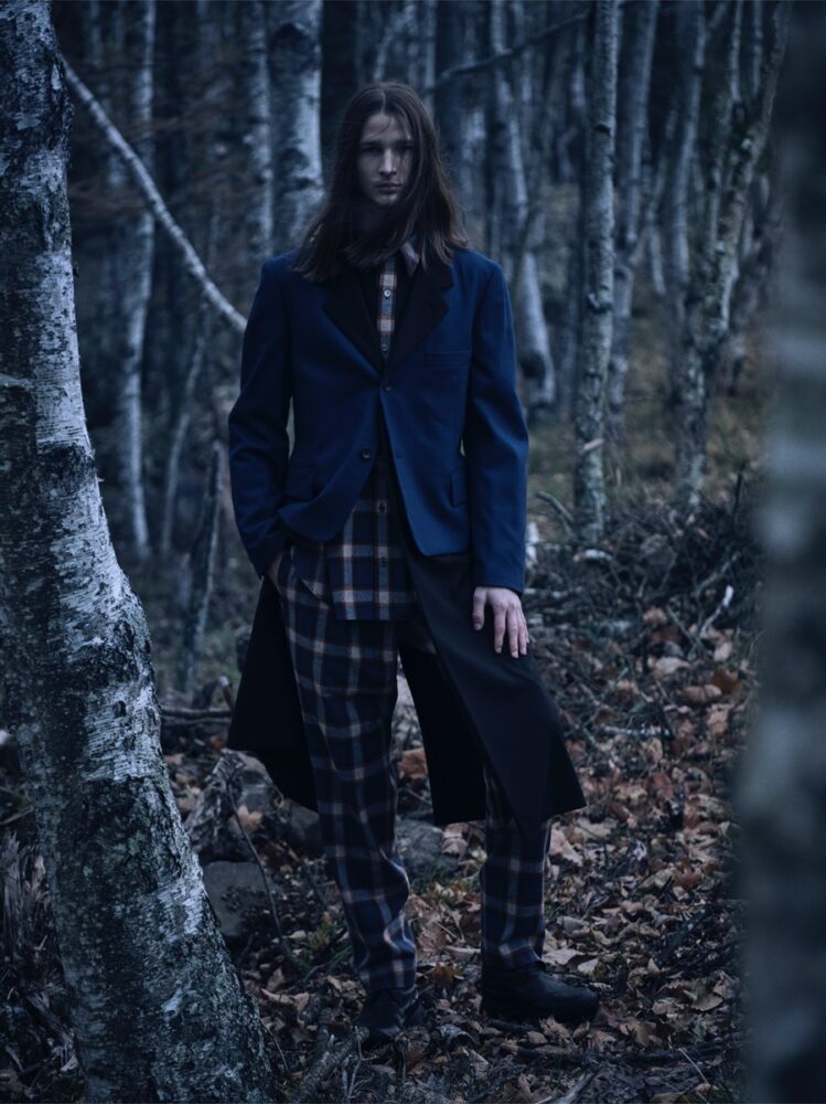 本コレクションでは、Yohji Yamamoto POUR HOMME 2008-09AWランウェイに登場したチェック柄アイテムを再構築し、ジャケット、シャツ、パンツを展開する。ブランケットのように贅沢にチェック生地を用いた分量感のあるストールジャケットや、レイヤード構造のジャケット、プリーツ部分にチェック生地を縫い込んだジャケットなど、ロング丈のジャケットに細身シルエットのパンツを組み合わせている。希少なUSメイドのペンドルトンチェック生地のオーセンティックで温かみのある表情を、ヨウジヤマモトならではのシルエットやデザインと組み合わせ、新たなスタイルとして提示する。