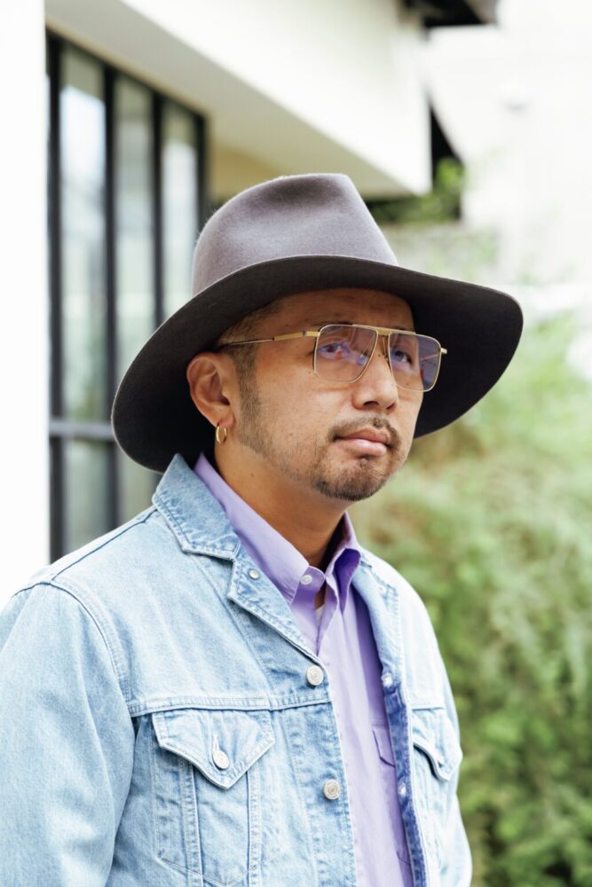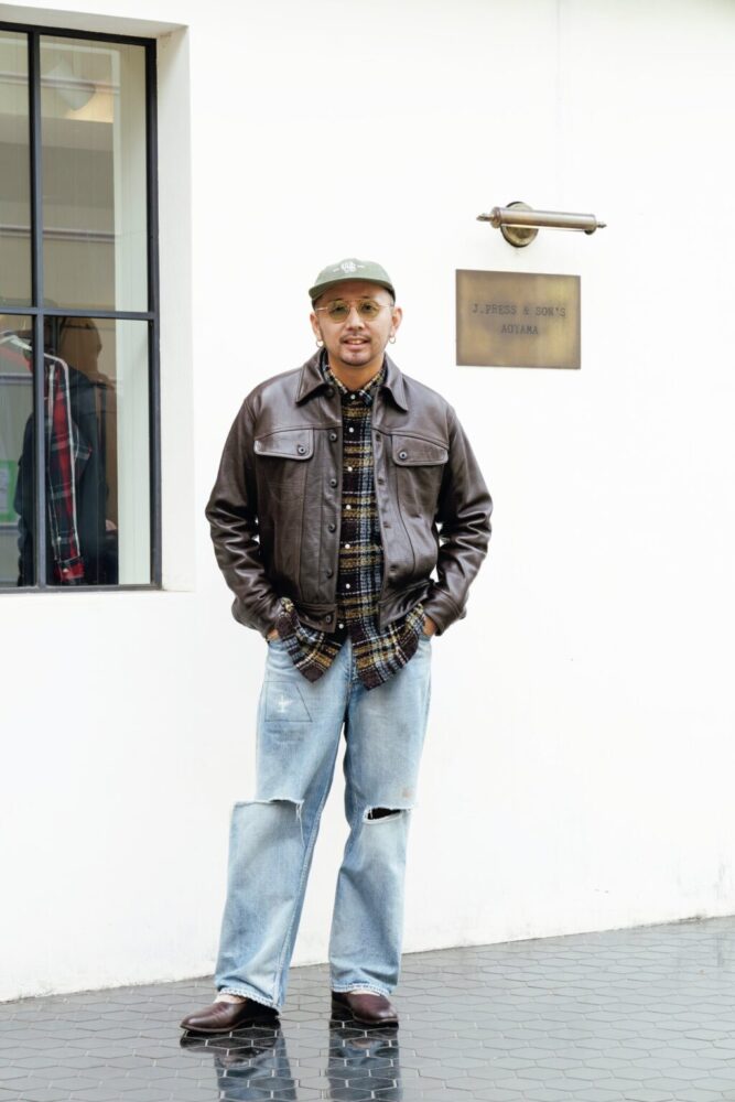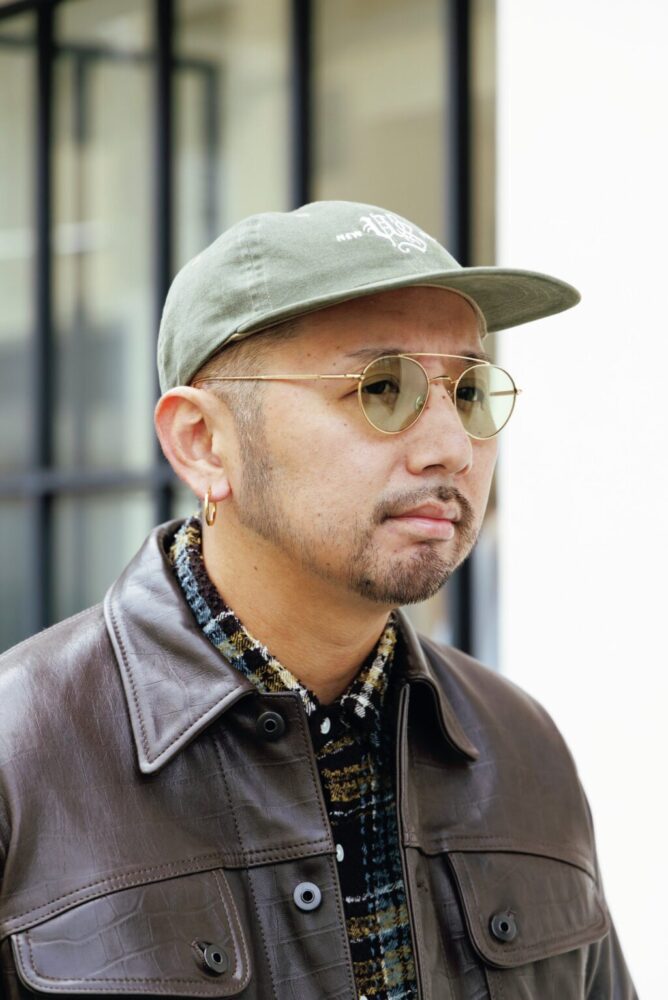 「自分は、その日のコーディネイトのなかで帽子とメガネは最後の最後に決める派です。帽子とメガネで今日の気分を最終的にチューニングするわけです。このコーディネイトの場合、レザーブルゾンのブラウンカラーが中心となるので、キャップとサングラスはアースカラーで連携させてグリーンを合わせています。変に浮いてしまわないように。また、レザーブルゾンを取り入れたスタイルが重く見えてしまわないように、キャップとサングラスはフォルムにも気を遣っています。冬でも適度に軽やかなニュアンスが出るようにね……。さらには、ピアスのゴールドに合わせてサングラスのメタルフレームもゴールドにして、顔周りのカラーバランスにも配慮しています」