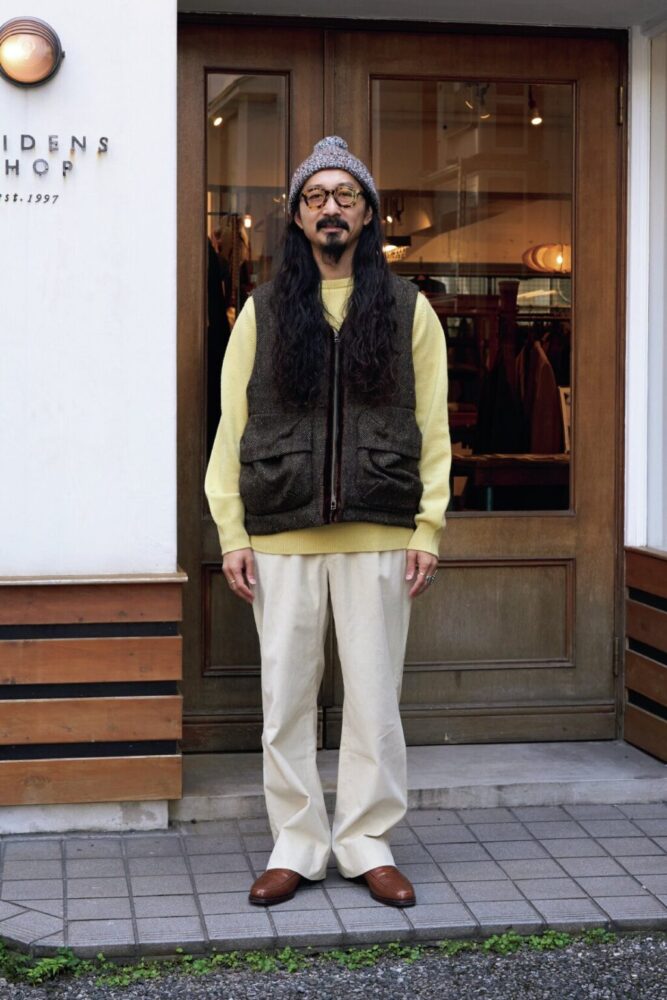 「ニットキャップはポンポンが付いたノスタルジックなものが気分で、一昨年くらいからコーギーに別注したりしていますね。また、自分はメガネを常時掛けているわけではないので、掛けるとしたらフレンチヴィンテージをアクセサリー感覚で取り入れています。今日はツイードベストとコーデュロイパンツで温もりをプラスしながら、ニットキャップとセーターをカシミヤ素材にして、懐かしい雰囲気の中にも大人の余裕が漂うスタイリングを意識しています」