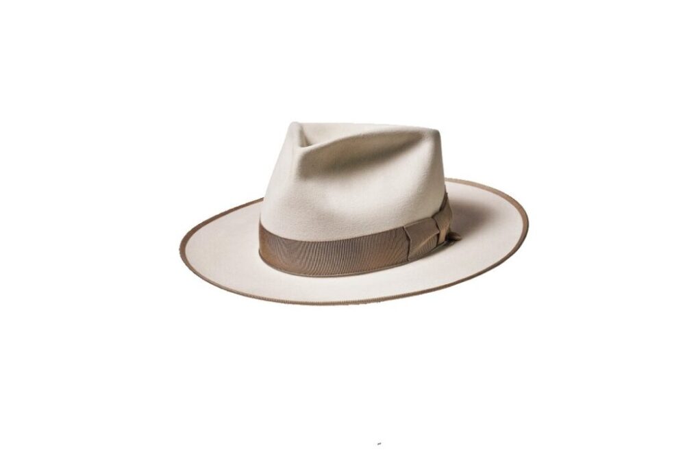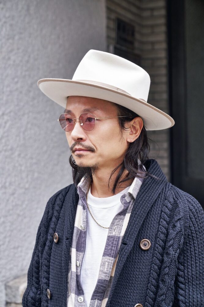 「今、自分の中ではウエスタンが気になっていて。ドレスとウエスタンの要素を掛けわせたようなドレスタンなハットは、野暮ったく見えないように明るいアイボリーカラーのビーバーファーフェルト素材を選びました。サングラスはクラシックなメガネをデザインソースにしていますが、チタンフレームを使っていて現代的な軽い掛け心地や見え方がポイント。これらのおかげで、ウエスタンな装いで攻めつつも知的で上品な仕上がりになっていると思います」