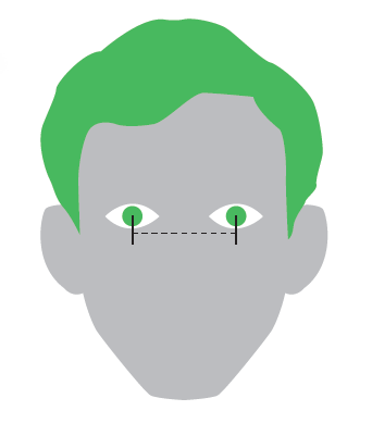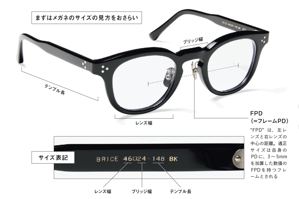 まず大前提として、メガネ業界では両目の瞳孔の中心の距離をPD(瞳孔間距離)と呼ぶことを覚えておこう。これが言わば実寸である。次にメガネ自体のサイズは、レンズ幅とブリッジ幅の合計(=FPD)で見る。メガネ自体にはこれらに加えてテンプルの長さが記載されていることが主だが、こちらはあまり気にしなくてよい。FPDを知るための数値はテンプルに記載されていることがほとんど。