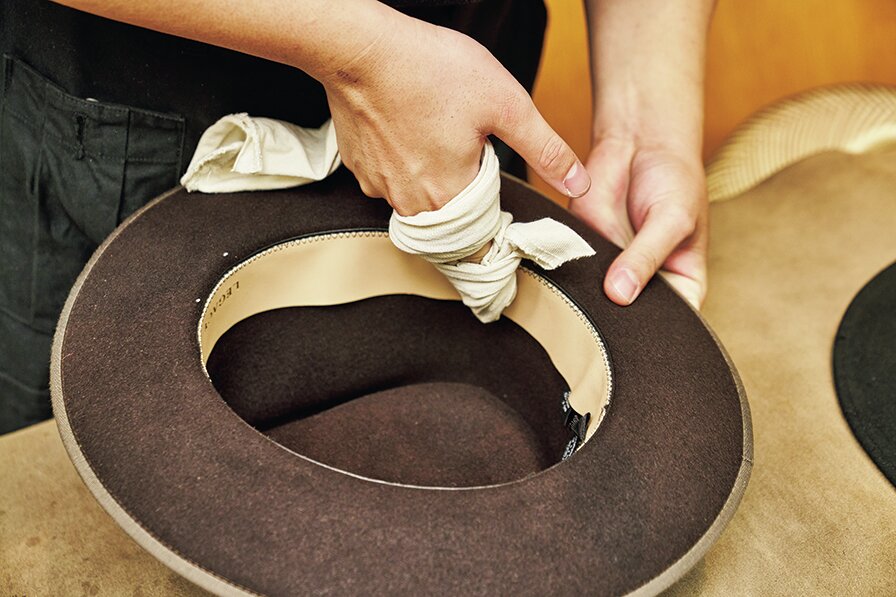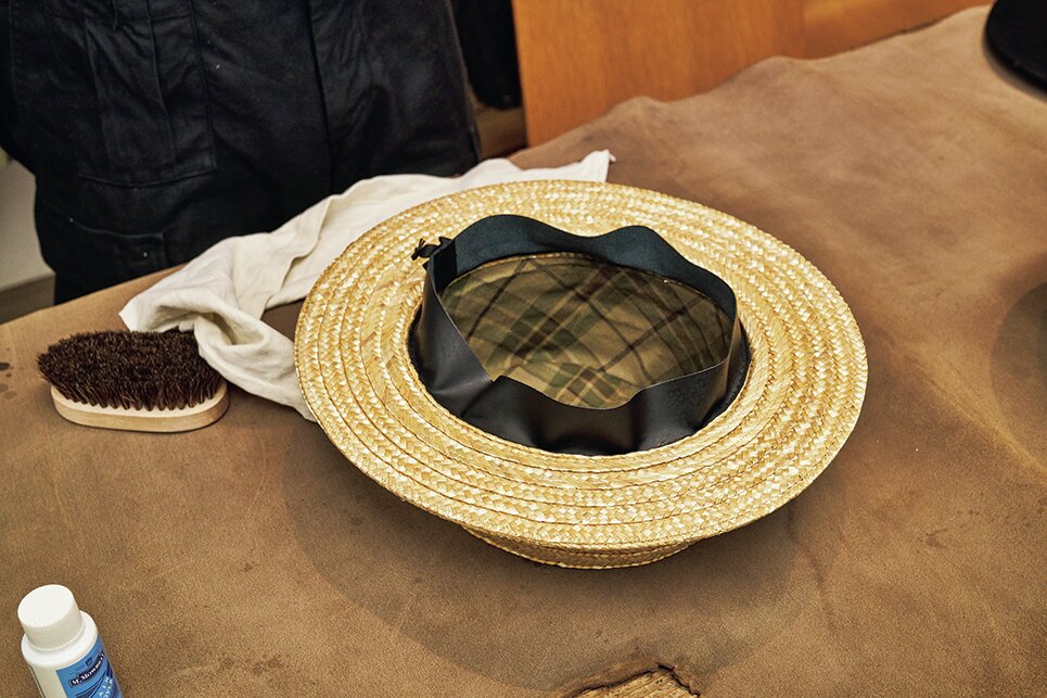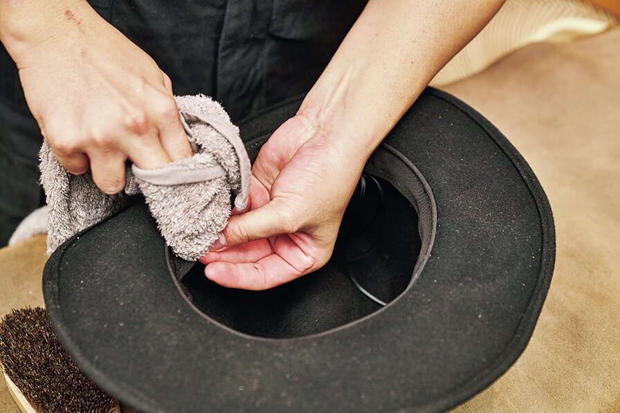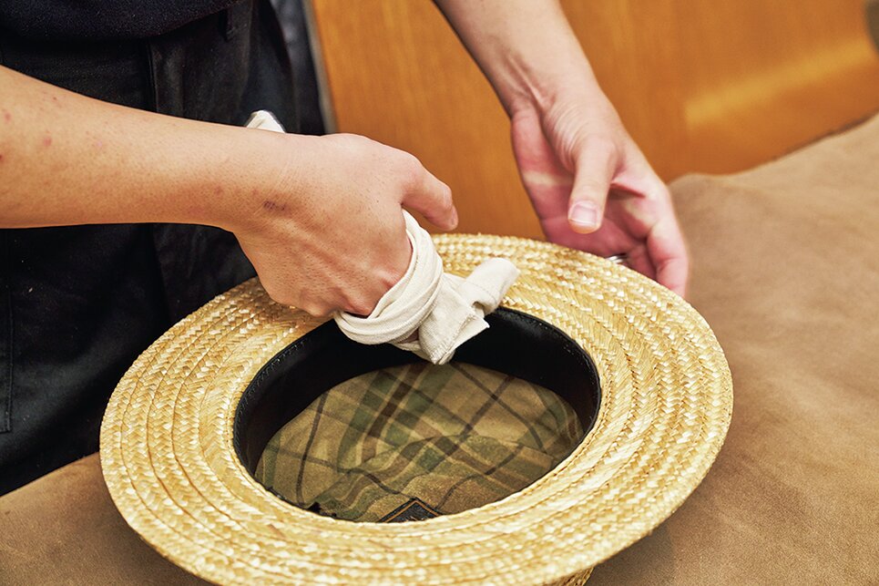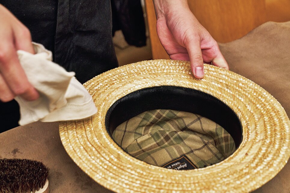 ブラシで埃を取り、汚れを乾拭きします。帽子の内側部分に、「スベリ」という縫い付けられたテープ状の汗止めがあるので、広げて乾燥させます。布製のスベリの場合は、洗剤入りの水をつけた布で汚れを取り、広げて乾燥させます。